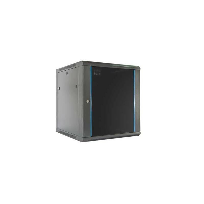 | Características | – Unidades: 12 U – Suministro: desmontado – Instalacion: montaje en pared – Puerta: cristal templado serigrafiado con cerradura y llaves – Paneles laterales: desmontables – Entradas de cable: superior e inferior con medidas ajustables – Material: acero laminado SPCC – Acabado: pintura negra fosforica anti oxido – Espesores: perfil de montaje 2,0 mm; angulo de montaje 1,5 mm; otros 1,2 mm – Grado de proteccion: IP20 – Capacidad de carga estatica: 50 kg Dimensiones – 600 x 600 x 635 mm |