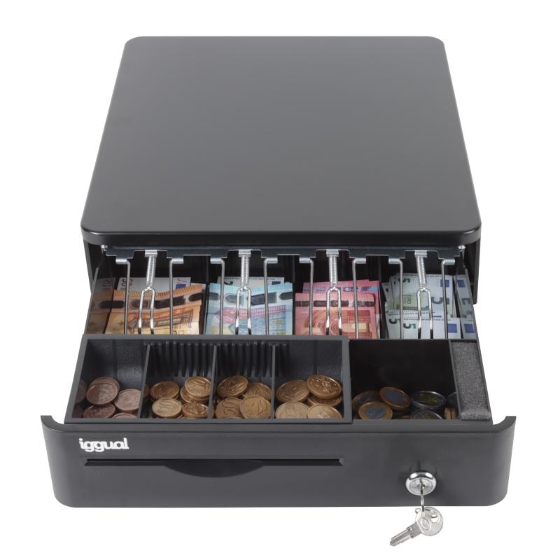 | Características | – Ranura de acceso frontal para cheque, recibo, etc. – Rodillos de cojinete de bolas de alta resistencia – Cerradura de tres posiciones de bloqueo – Apertura manual o automática – Compartimentos: 4 billetes y 5 monedas (1 fijo + 4 ajustables) – Interfaz RJ11 (alimentación 12V) – Incluye cable RJ11 de 1 metro de longitud – Dimensiones: 380 (profundo) x 335 (ancho) x 90 (alto) mm – Peso neto: 3,6 kg – Peso bruto: 4,6 kg – Humidificador de yemas – Bordes redondeados – Color: negro – Juego de 2 llaves |
